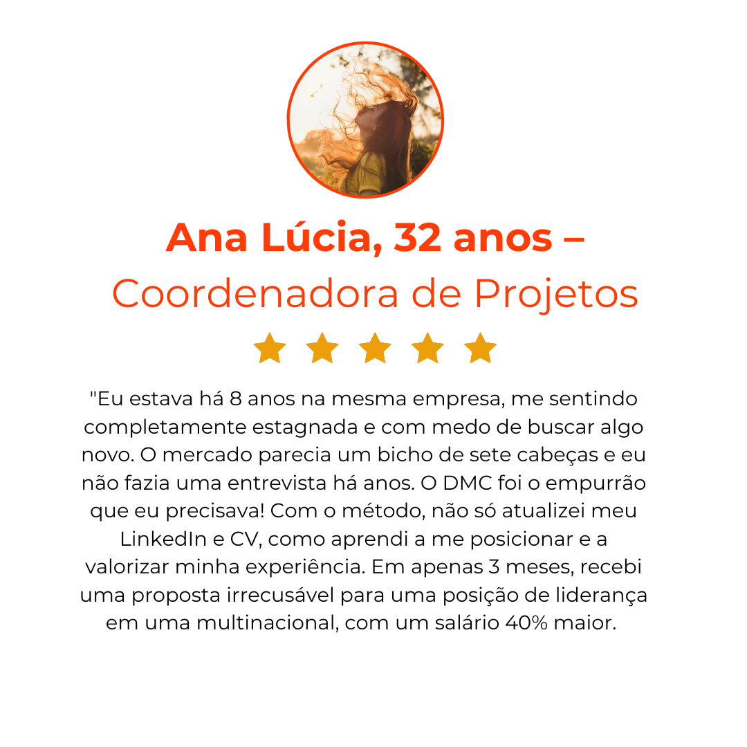 A resposta é um sonoro sim! Nosso método, desenvolvido e testado ao longo de 5 anos, já recolocou mais de 500 profissionais no mercado, com uma impressionante eficácia superior a 88%. Seja você um estagiário buscando a primeira oportunidade, um profissional querendo ser encontrado no LinkedIn com propostas reais, ou alguém que almeja promoção e um salário muito maior, o DMC tem a solução.